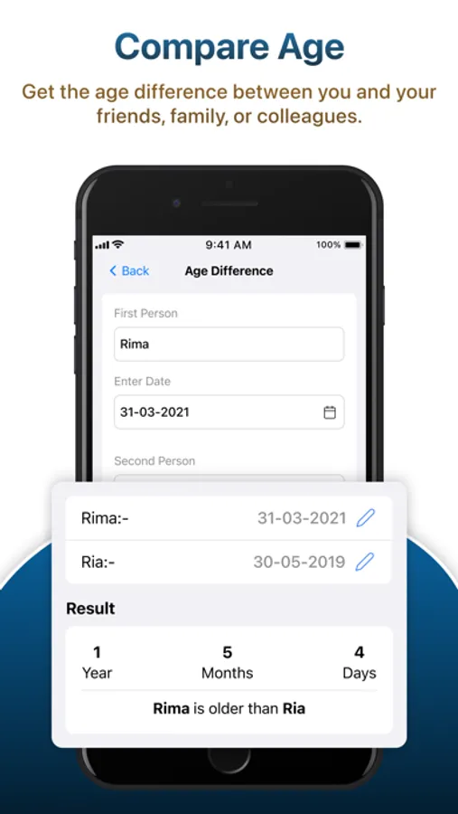 With Age Calculator by Date of Birth you can also calculate the remaining days of your next upcoming birthday or any anniversary. The app also acts as a date and time difference calculator. Calculate the difference between two dates and times down to minutes and seconds.