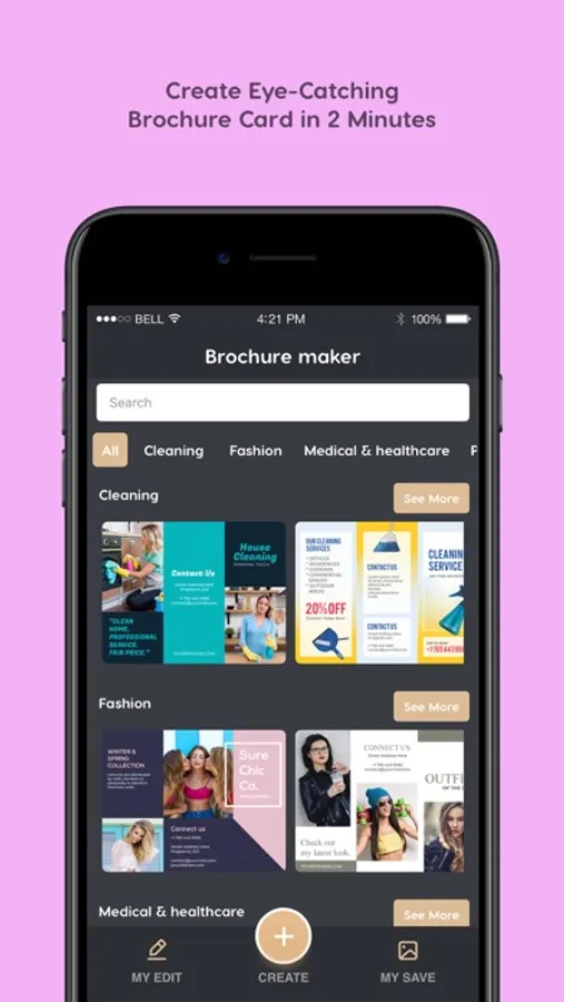 This app provides tri-fold brochure, two-fold brochure, product catalog, leaflet templates, advertising pamphlet, promotional poster designs.