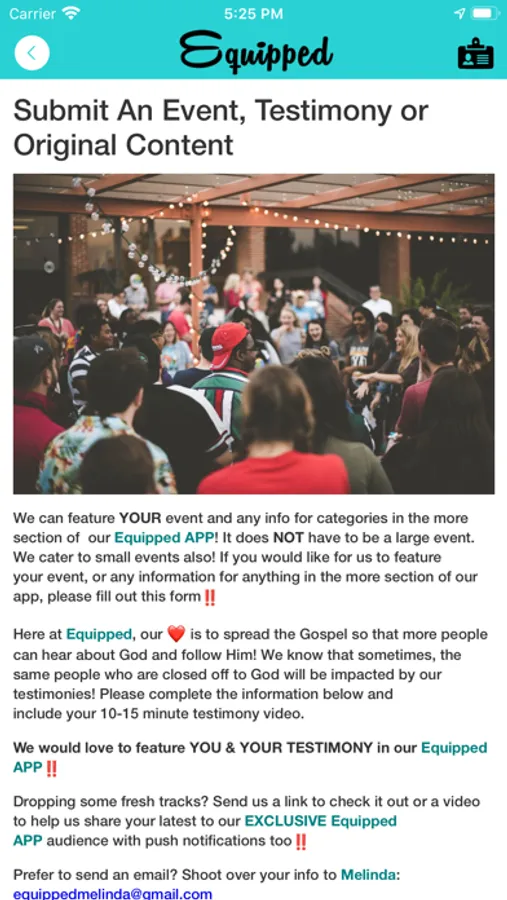 Our app is easy. Download, click on your city and the events pop up! Each event shows "who, what, when, where and how! Our hope is to get people up, out and helping around the world! Download our app and get EQUIPPED!