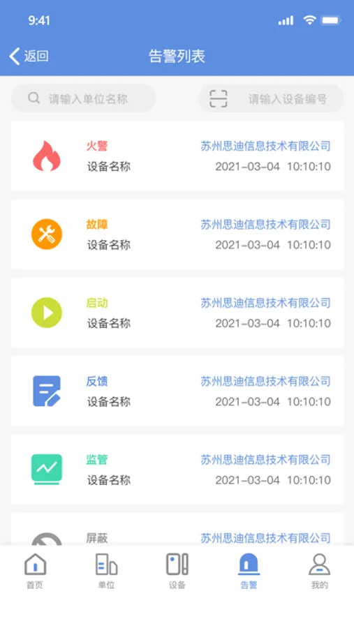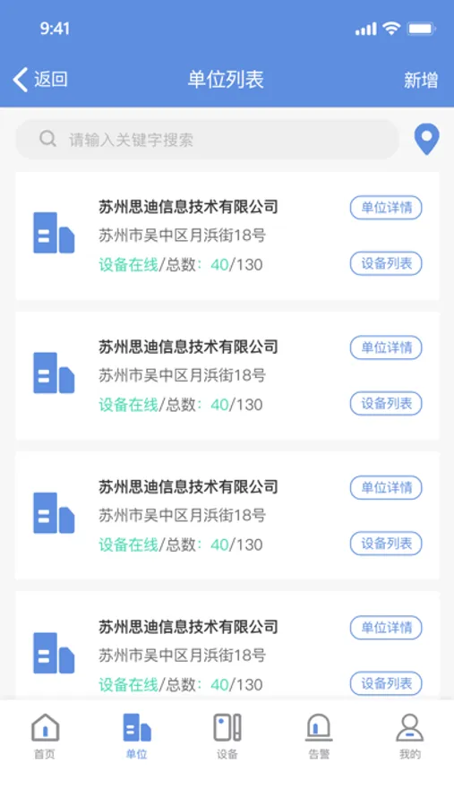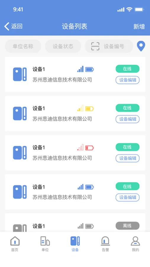 苏州思迪信息技术有限公司旗下的一款物联网设备设施配置工具。该app可以查看单位列表,设备列表,告警列表的单位、设备、和告警信息。主要功能是新增和修改单位或设备设施信息,让施工人员在配置设备的过程中更加轻松和快捷。