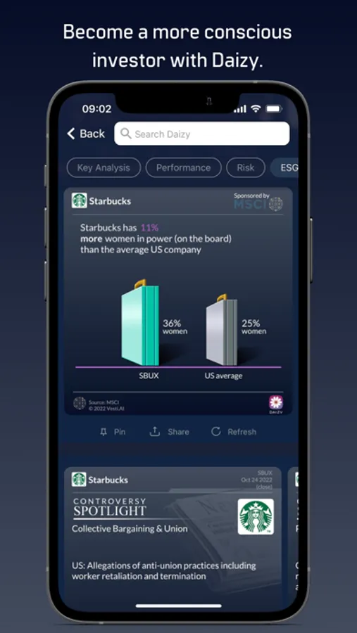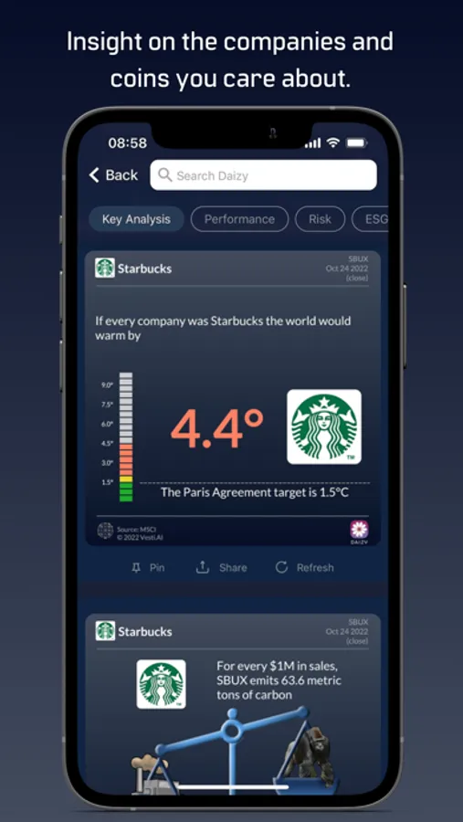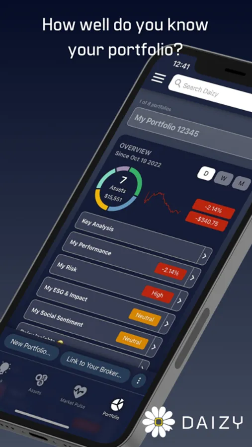 There are many investment analysis apps out there, but Daizy has been designed to offer you more than simple performance tracking and news flow. Our portfolio analysis and stock deep-dives help you uncover and understand data usually reserved for professional investors. Our unique visualizations have been created to give you context and understanding of this data so you can become a better investor. Our stock, ETF, and crypto deep-dives give you a full breakdown including performance, risk, impact, news, climate, carbon, sentiment, market, correlation, controversies, morality, and more!