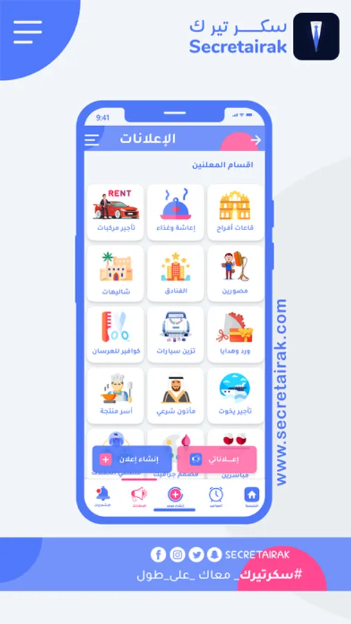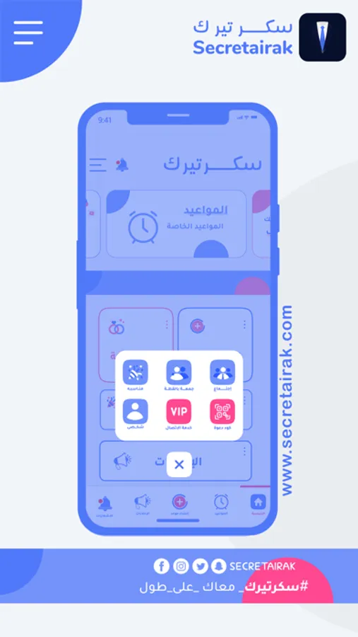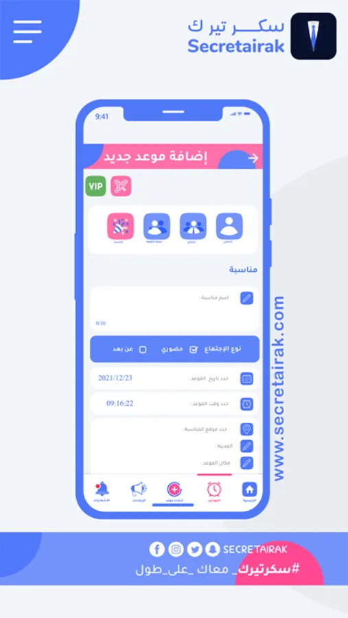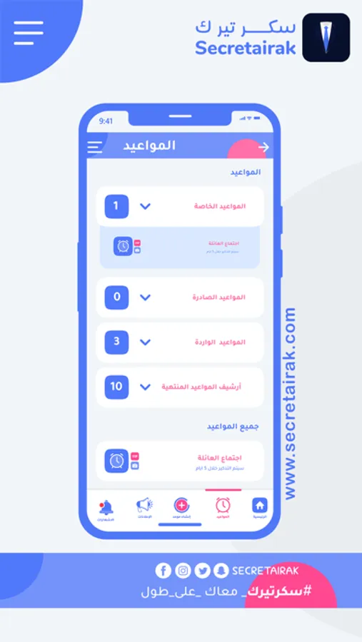 التطبيق الأول من نوعه في تنظيم الإجتماعات، المناسبات والمواعيد, وكمان سكرتيرك فيه خدمة مميزة للإتصال بمدعوينك هاتفياً قبل الموعد وتذكيرهم بالموعد, مو بس كذا تقدر تنشر إعلانات لخدماتك أو أنشطتك التجارية من خلال أقسام التطبيق مع إمكانية متابعة المشاهدات والإعجابات وتقييمات العملاء...#سكرتيرك_معاك_على_طول
