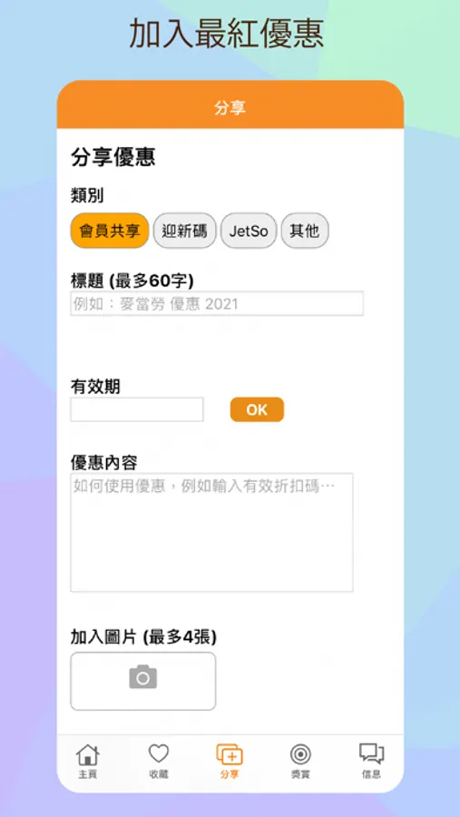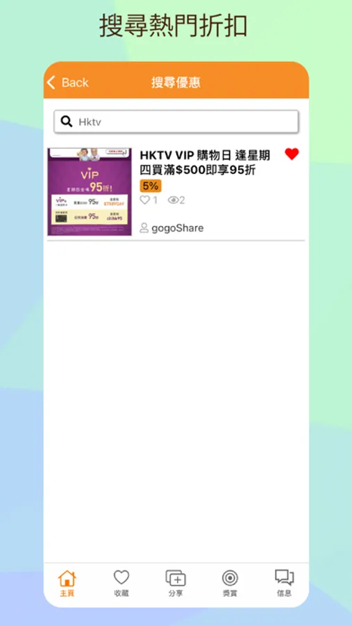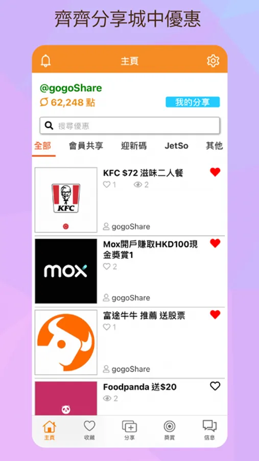 透過gogoShare一站式優惠平台,可以由用家提供同時又可獲得最新嘅優惠活動,例如:會員優惠、迎新優惠又或者網購優惠碼等等。幫助大家每一日都慳到盡!咁好嘅app即刻同朋友一齊下載啦!