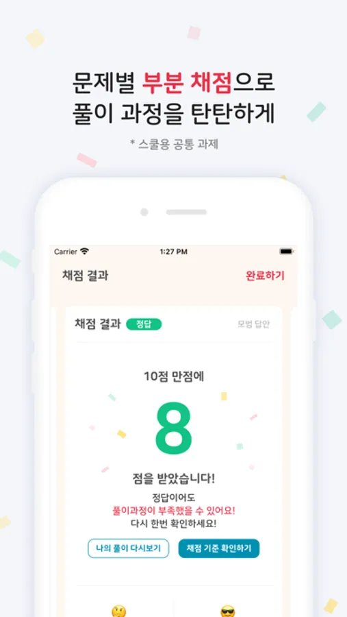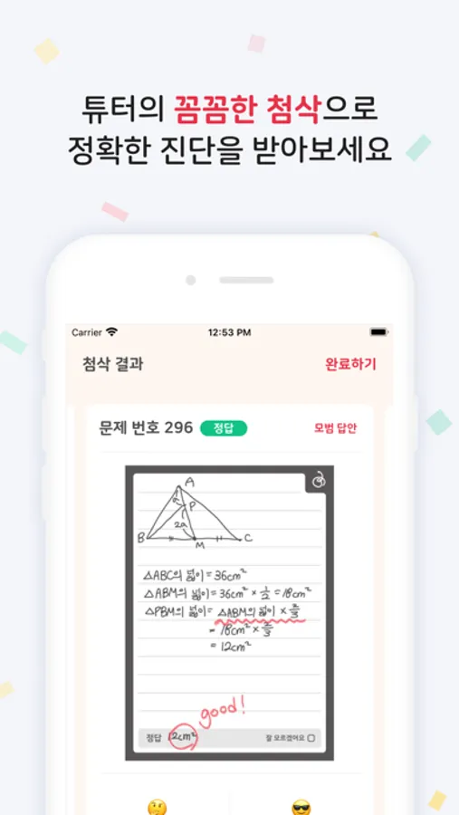 - 당사에서 직접 선발하고 관리하는 전문 튜터가 제출된 풀이를 하나 하나 꼼꼼히 확인 후, 어디까지 잘 풀었는지, 어떤 고민이 더 필요한지 명확하게 첨삭하여 제공합니다.