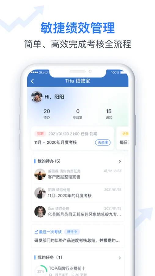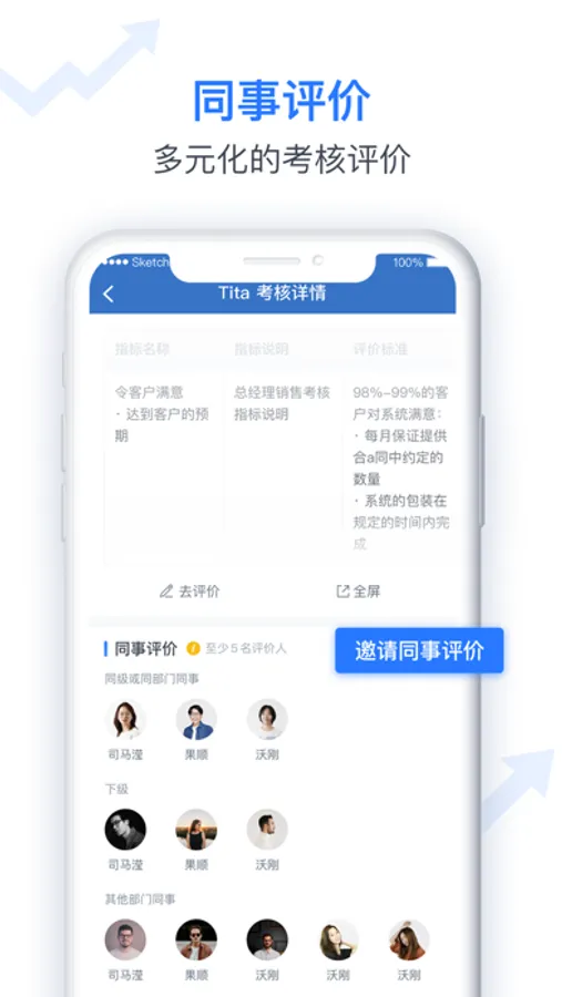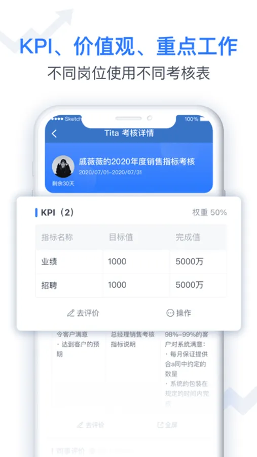 Tita 绩效考核是一款轻量级、模板化的绩效考核应用,支持对员工的工作业绩、行为价值观等进行考核,包含定量指标、价值观指标、OKR 指标、工作执行指标和总结式指标等多种指标类型,支持上级评、360评价等多样化的考核流程,帮助企业落地绩效考核管理。