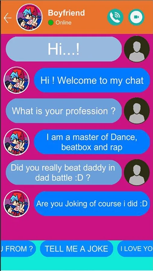 Dance on funkin songs, chat with mark the Friday night boyfriend call and see funkin videos out and also the boy can beatbox for you in a call, all that for free and in one game. Its your chance to have a chat and call with Friday night guys listening to their soundtracks like fresh, dad and pico battle sounds.