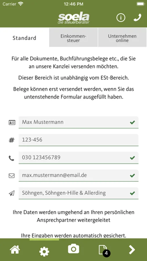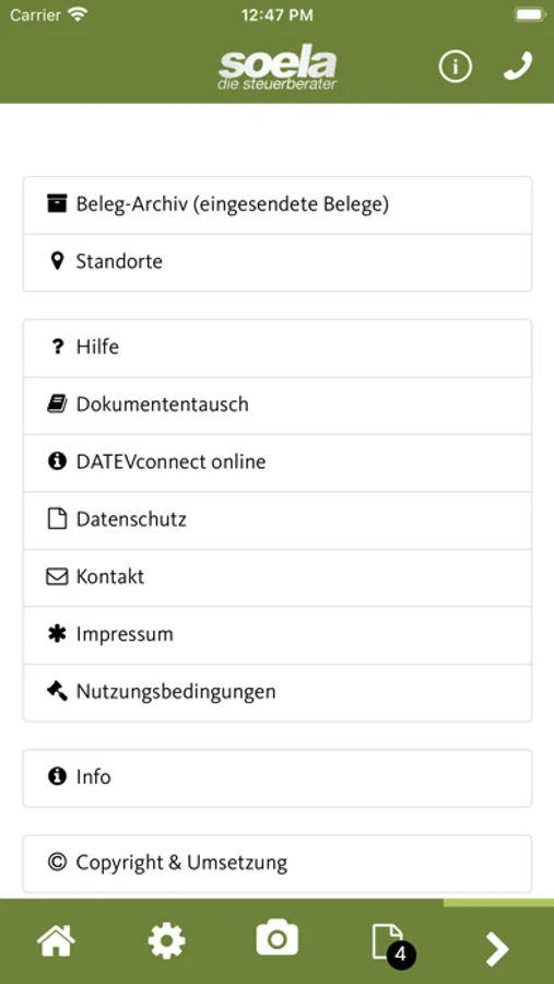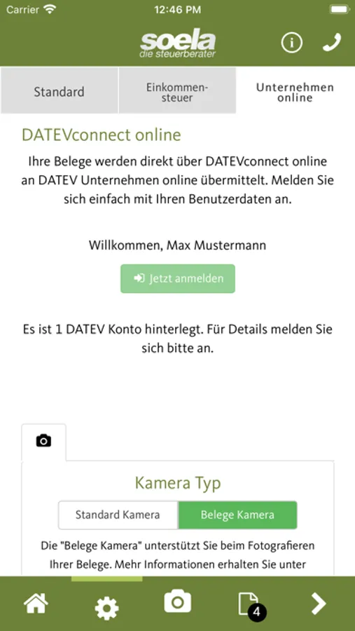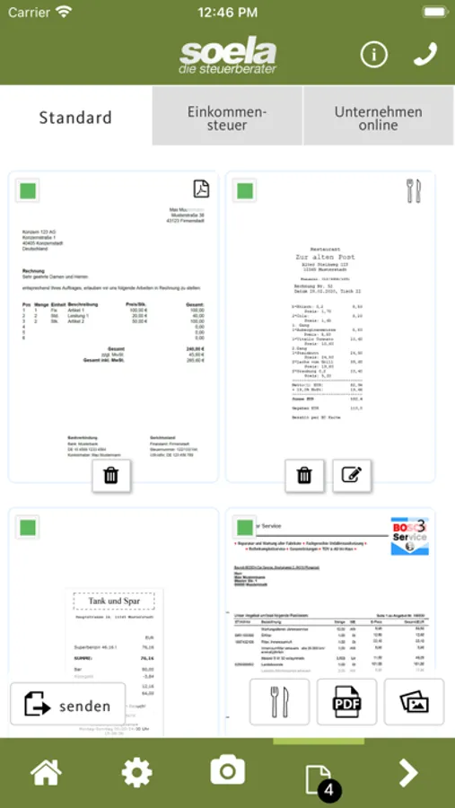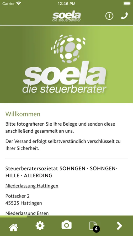 Mithilfe dieser App können Belege, Dokumente und andere Schriftstücke schnell, sicher und komfortabel an Soela - Die Digitalkanzlei gesendet werden. Machen Sie einfach ein oder mehrere Fotos von den Belegen und versenden Sie diese mit einem Klick direkt aus der App heraus an Soela - Ihre Steuerberater in Hattingen und Essen.