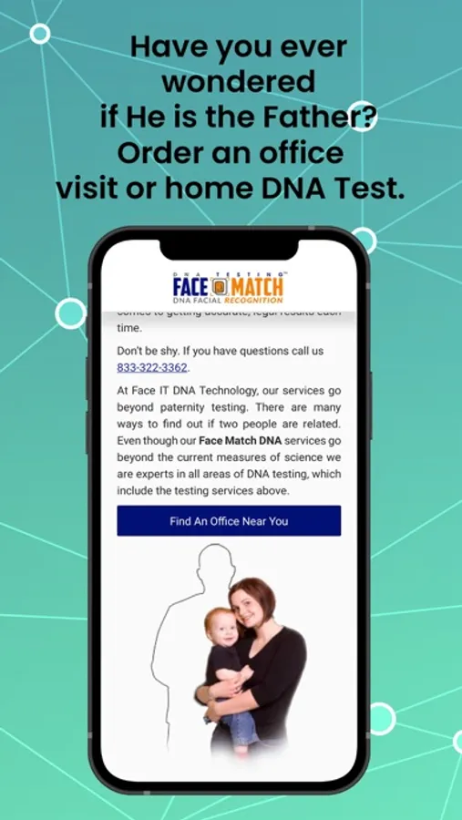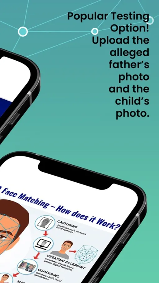 Here’s an example of how DNA Face Matching and Ancestry Face Matching Works: Our face recognition technology will scan several facial features, for example the alleged father's eyes and compare that calculation to the shape of the potential child’s eyes. You could even compare the facial profiles of one sibling to another sibling. Various algorithms are in place that allow a grandparent, sibling, father, child, aunt, uncle or a cousin to verify relationship. Face Match DNA Technology has the capability to do this with several facial points. For example, the nose, cheeks, ears, head, chin and several other parts of the human face. We use 68 different facial points!