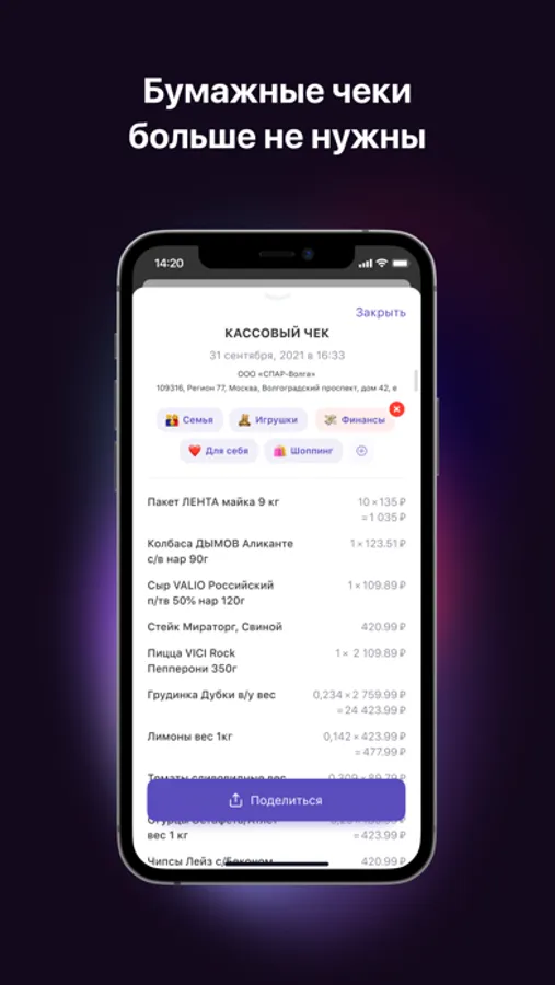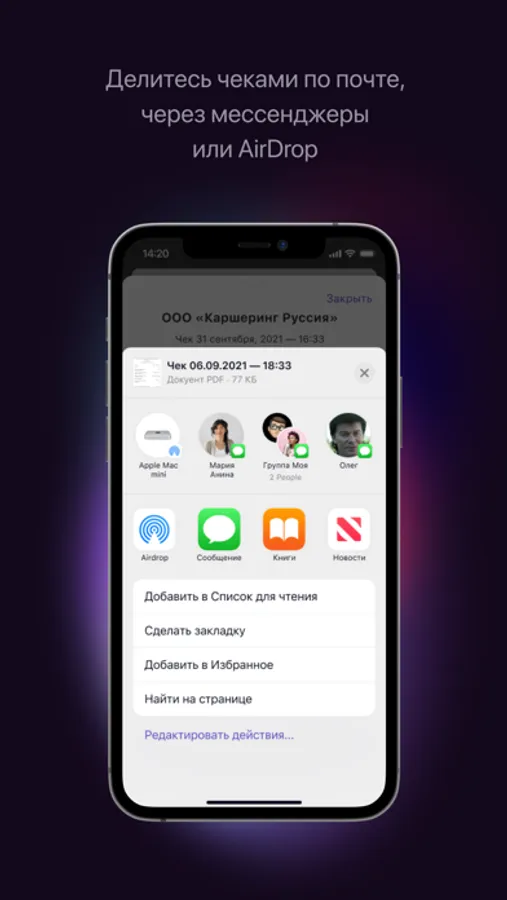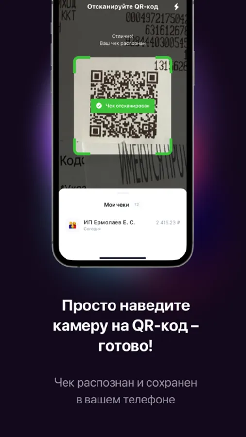 Просто наведите камеру на QR-код – готово! Чек распознан и сохранен, теперь можно переслать его по почте, через мессенджеры или AirDrop.