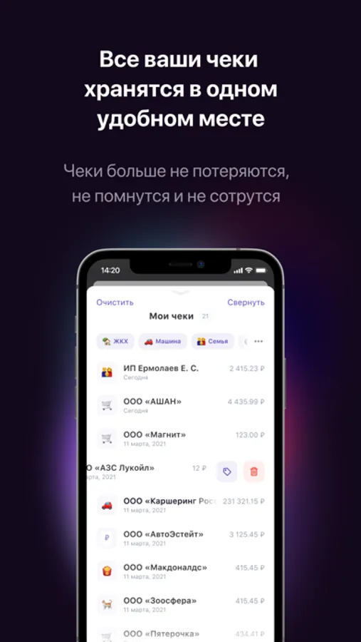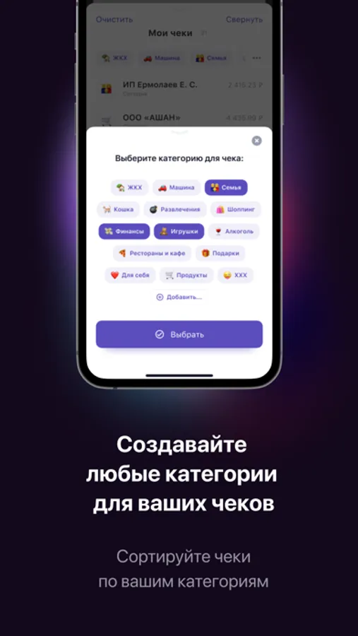 Создавайте и редактируйте категории для удобной сортировки чеков. Каждому чеку можно присвоить одну или несколько категорий. Какими именно будут ваши категории – решаете только вы сами.