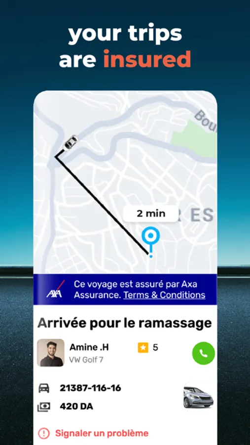 Unlike our competitors, all our rides are insured by our partner Axa, in order for you to fully enjoy your trip in complete safety.