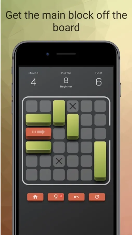 Every puzzle level is a board with the main block that is stuck between other blocks. Horizontal and vertical blocks must be moved out of the way of the main block in order for it to escape the board! Move the main block all the way to the right side of the game board (exit). Vertical blocks can slide up and down ↑ ↓. Horizontal blocks can only be moved from side to side ← →. Use your logic and thinking skills and solve puzzles!