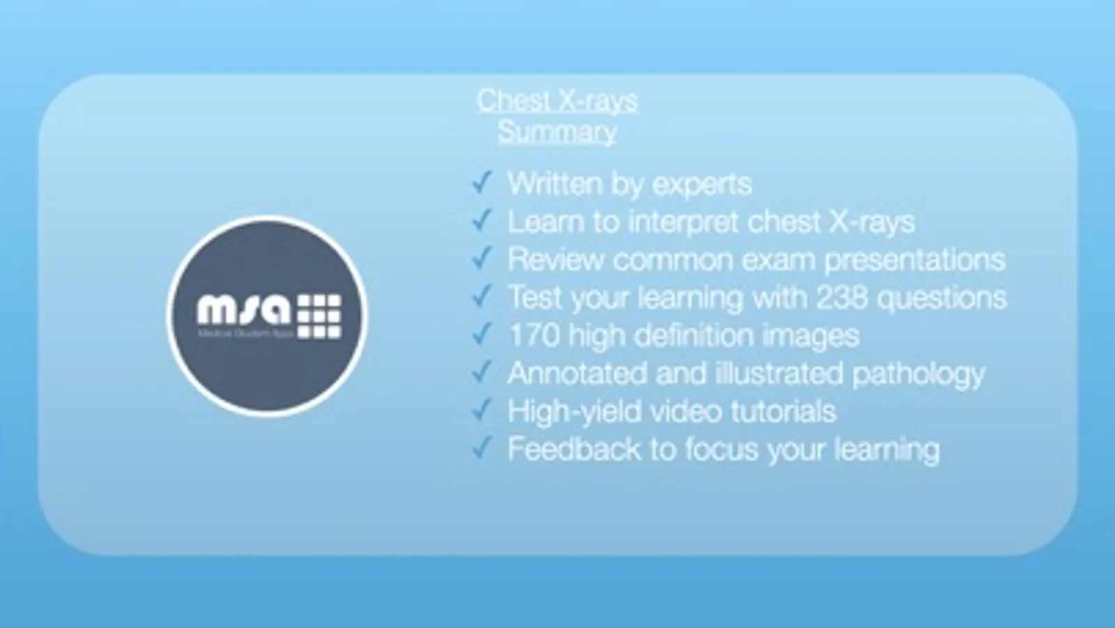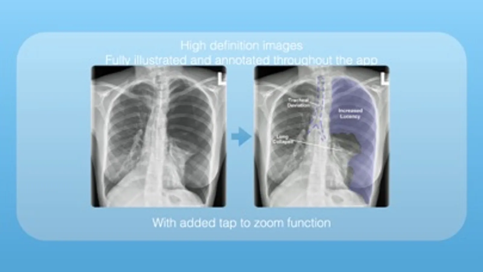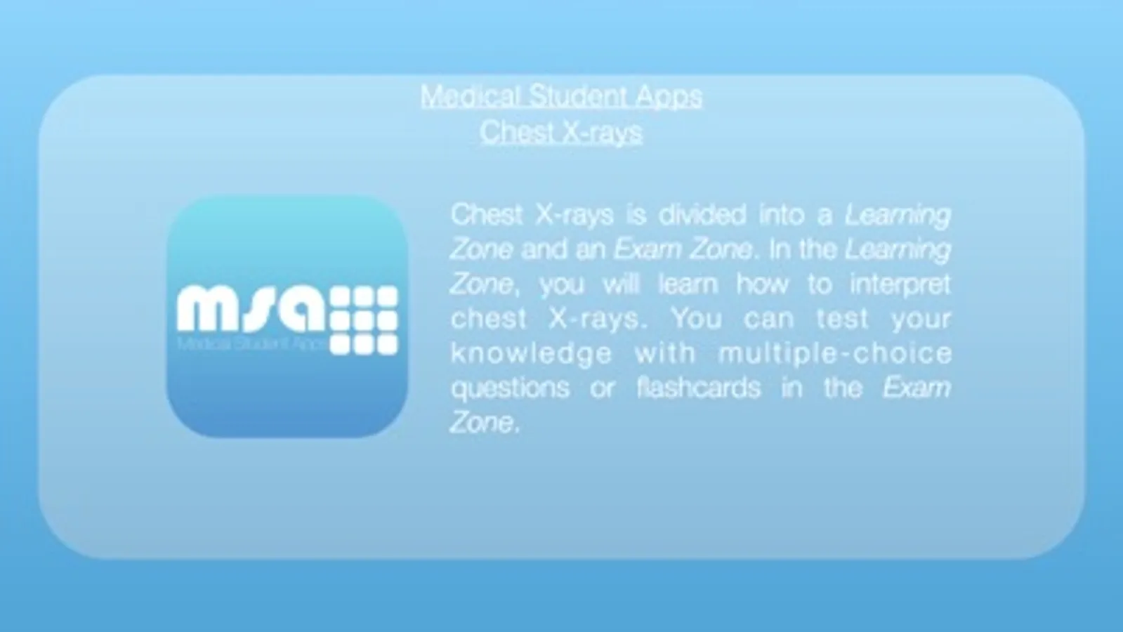 Medical Student Apps Chest X-rays is an essential application for medical students at all levels of study. The app contains two core learning areas: The Learning Zone and the Exam Zone.