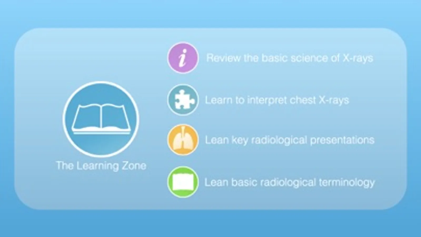 In the Learning Zone, you can review the basic science of taking a chest radiograph and learn a very simple mnemonic that will help you interpret chest X-rays throughout your career. You can also review high-yield radiological presentations and learn key terminology.