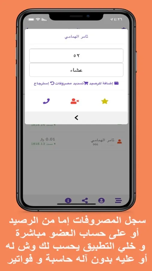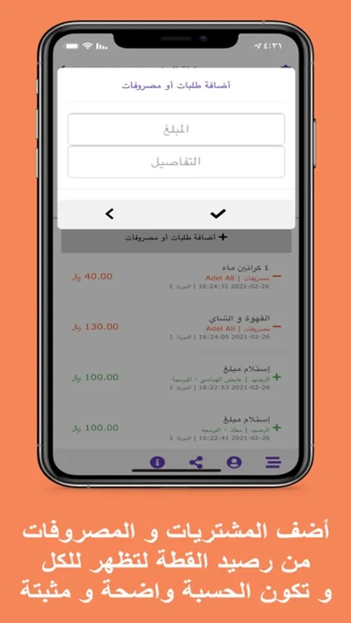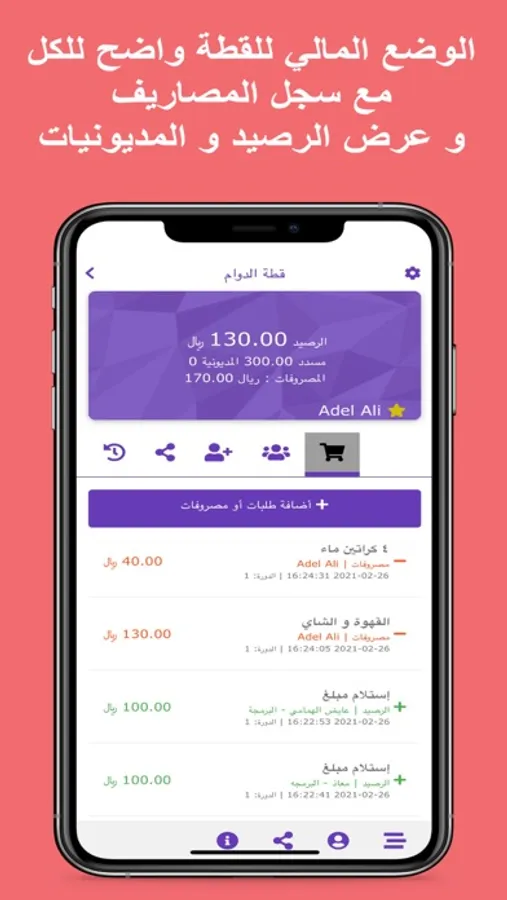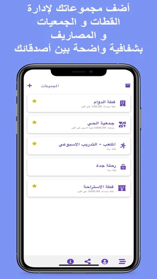 - شاشة تسجيل و عرض المصروفات و المشتريات مع التفاصيل تظهر بياناتها لجميع أفراد المجموعة و التحكم بها من قبل المشرف و مالك النجمة