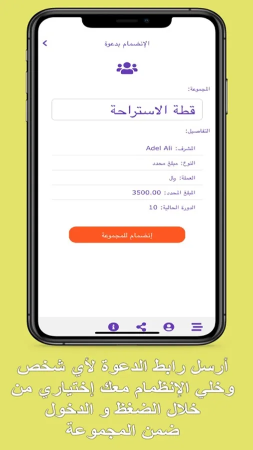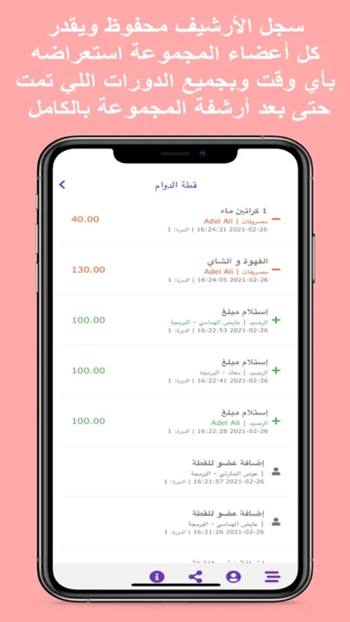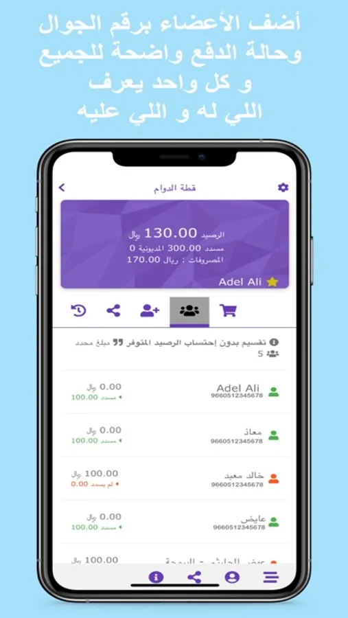 - شاشة عرض أفراد المجموعة مع عرض المبلغ المطلوب لكل عضو أو المبلغ المستحق له في حال قام بدفع مبلغ أكبر من القطة المحددة