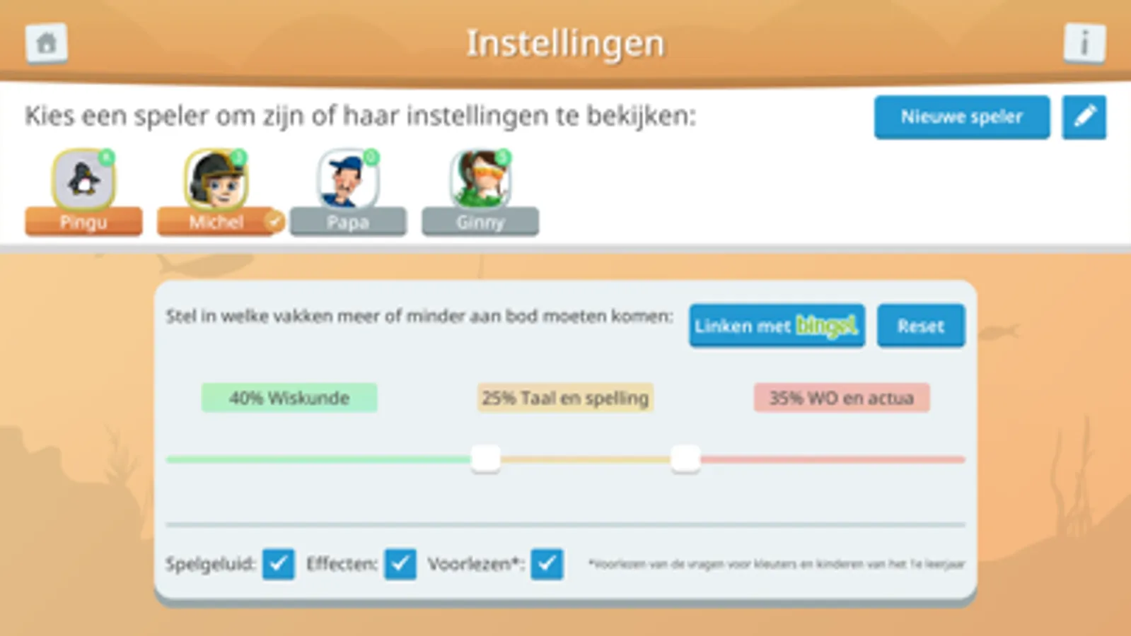 Om in te loggen gebruik je de inloggegevens voor Zomerbingel. Je kunt als ouder ook zelf aanduiden welke soort vragen er vooral aan bod moeten komen of het niveau met één klik afstemmen op de Bingel-resultaten van je kind.