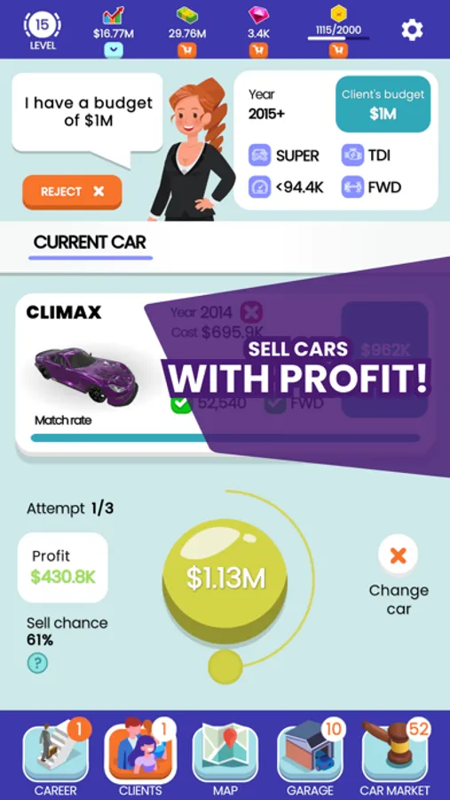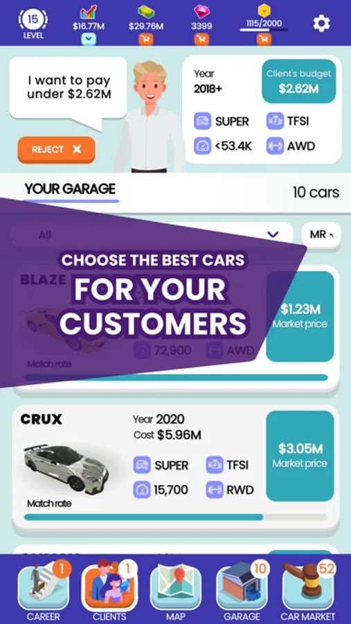 Have you ever thought what it's like to run and expand a used car business? Play as a young entrepreneur and make your own career! “Used Car Dealer” is a used car simulator game that simulates the process of purchasing and selling used cars. You will have several ways of purchasing cars, and almost 100 different car models to choose from. The clients have specific needs. One of your tasks is to find the most suitable car for them!