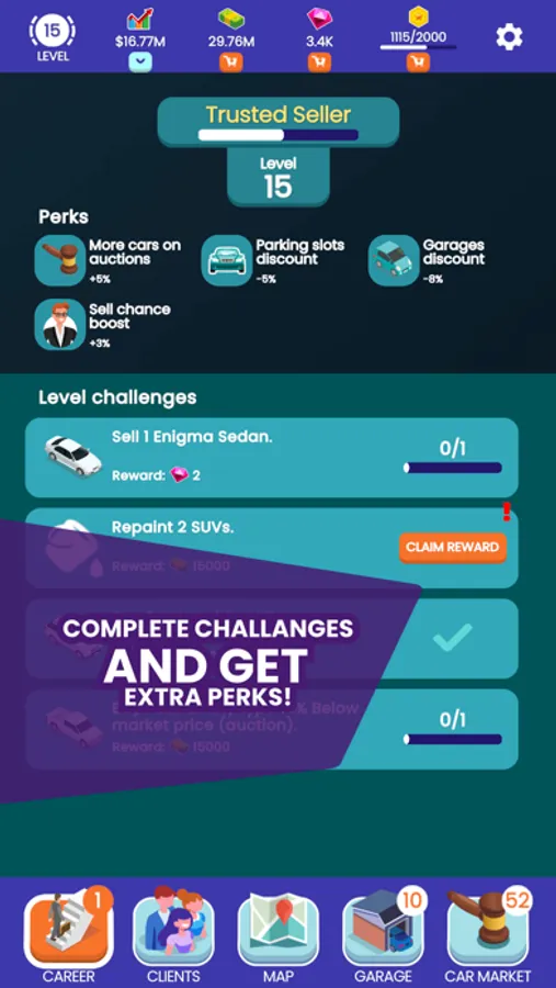 * Perk System - every 5 levels get unique bonuses such as increased sell chance of a car.