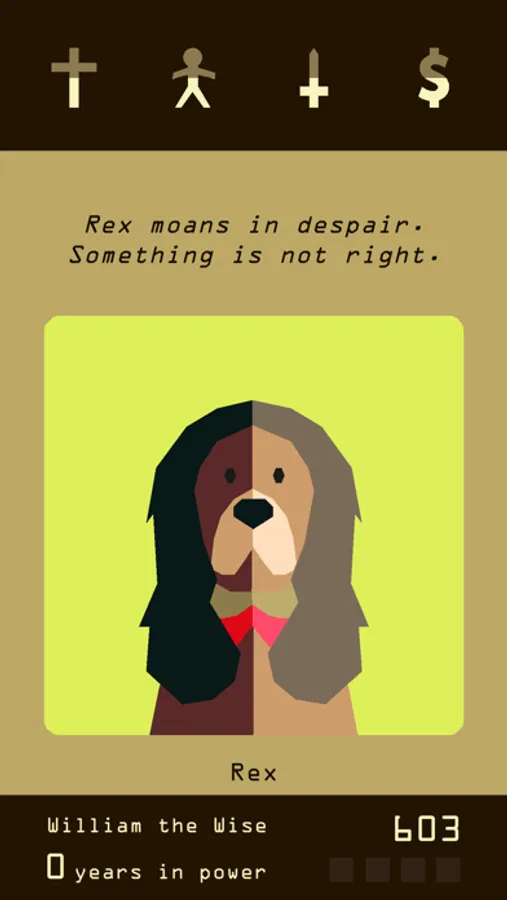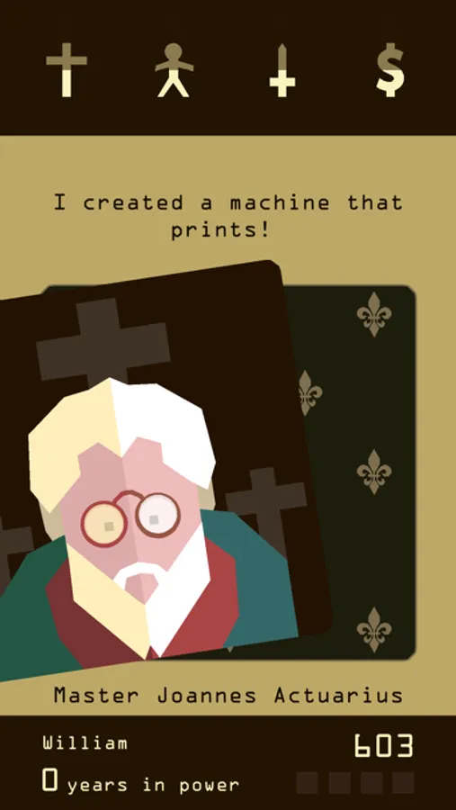 Each year of your reign brings another important – seemingly random – request from your unpredictable kingdom as you strive for balance between the church, the people, the army, and the treasury. Prudent decisions and careful planning make for a long reign but unforeseen motivations, surprise events, and poor luck can take down even the most entrenched monarch. Extend your reign as long as possible, forge alliances, make enemies, and find new ways to die as your dynasty marches along through the ages. Some events will span on centuries, with an intrigue involving burning witches, scientific enlightenment, wicked politics and, maybe, the Devil himself.