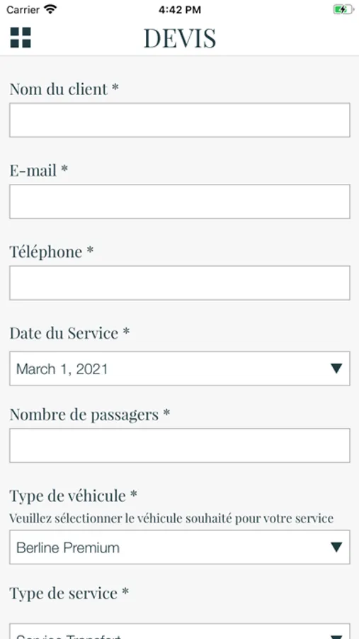 • Section Devis: Effectuez votre demande de transport VTC via le formulaire. Estimez votre trajet en toute simplicité! Indiquez vos coordonnées, sélectionnez votre date de départ sur le calendrier. Ajoutez le type de service, le nombre de passagers, le véhicule souhaité, le lieu et l’heure de prise en charge/dépose. Notez les infos du trajet retour si nécessaire. Laissez un message pour toutes informations supplémentaires pour votre transport! Puis, cliquez sur envoyer! Réponse de notre service client en moins de 30 minutes.