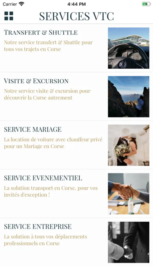 • Section Prestations: Découvrez nos différents services de chauffeur privé. Transfert Aéroport (Ajaccio Napoléon Bonaparte, Bastia Poretta, Figari Sud Corse), Navette GR20 Corse, Excursion en voiture ou minibus, Chauffeur Business, Navette Croisières dans les ports de Corse, Transport Evènementiel, Transport Mariage, Mise à disposition véhicule et chauffeur à l'heure, à la 1/2 journée, à la journée ou sur plusieurs jours.
