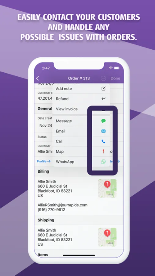 Staying in touch with your customers is as easy as a tap on your iPhone. Users can text, email, call or use WhatsApp whenever the need arises