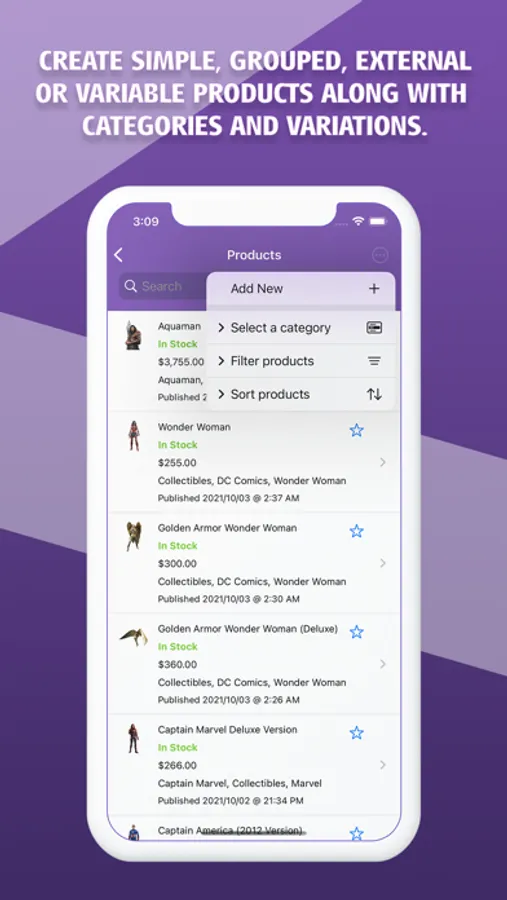 Managing Products: Users can easily keep track of their inventory and make modifications to it from SwiftyAdmin. Creating new products is a breeze. Create a new Simple, Grouped, External or Variable product, take pictures, upload* them to your Media Files Library, enter all the details of the product, create categories, add variations, set up sales etc...