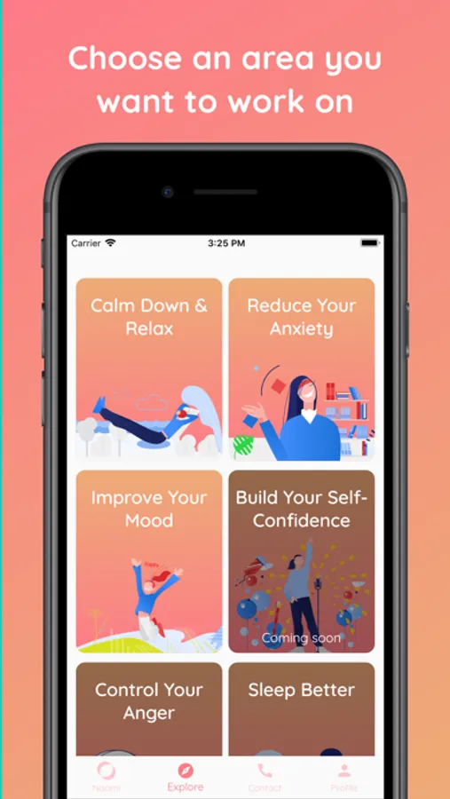 The Explore tab is the main tab where you can find all techniques for particular problems (depression, anxiety, stress, sleeping problems, anger etc). Each topic contains 15-20 specific techniques and conversational flows for resolving your problems.