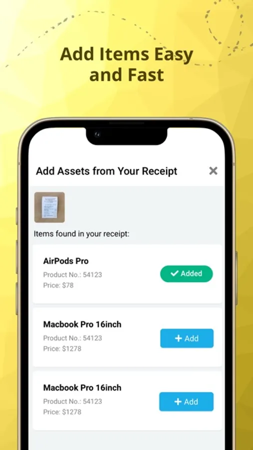 Scan receipts conveniently using your phone camera. AI will recognize the items in the receipt and fill in the fields. You can modify any fields, add photos and documents, and the warranty time and insurance extension.