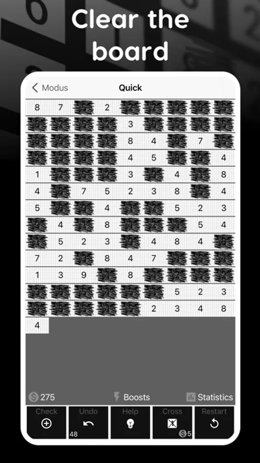 If you cannot or do not want to merge numbers, and you do not want to use Boosts, you then press "Check". All the numbers remaining on the board are then copied after the existing numbers and the numbers game continues.