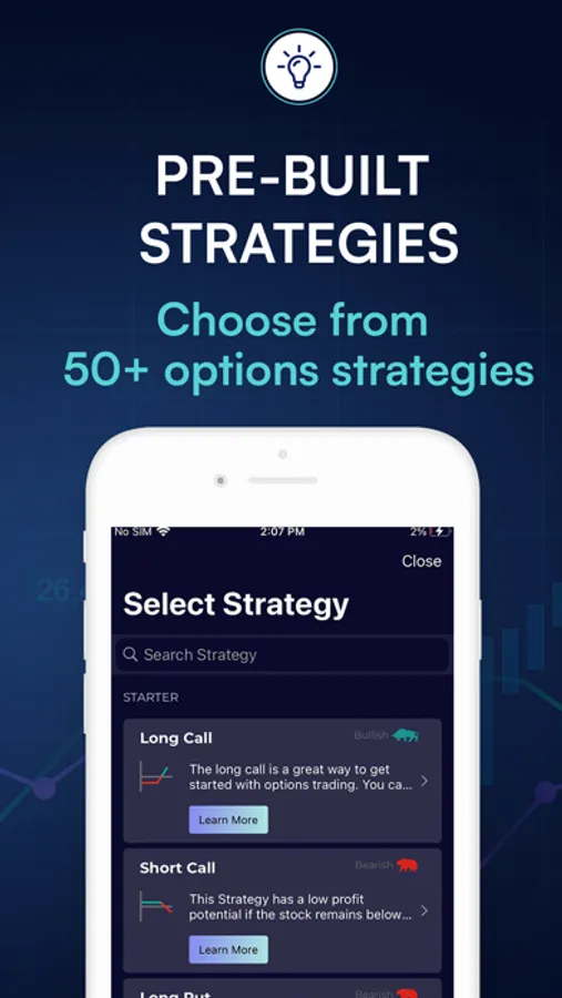 Potential options can be optimized better with a strategy in hand. Get access to a wide range of pre-built options trading strategies from more than 50+ different options strategies powered by real time brokerage data in a few taps!