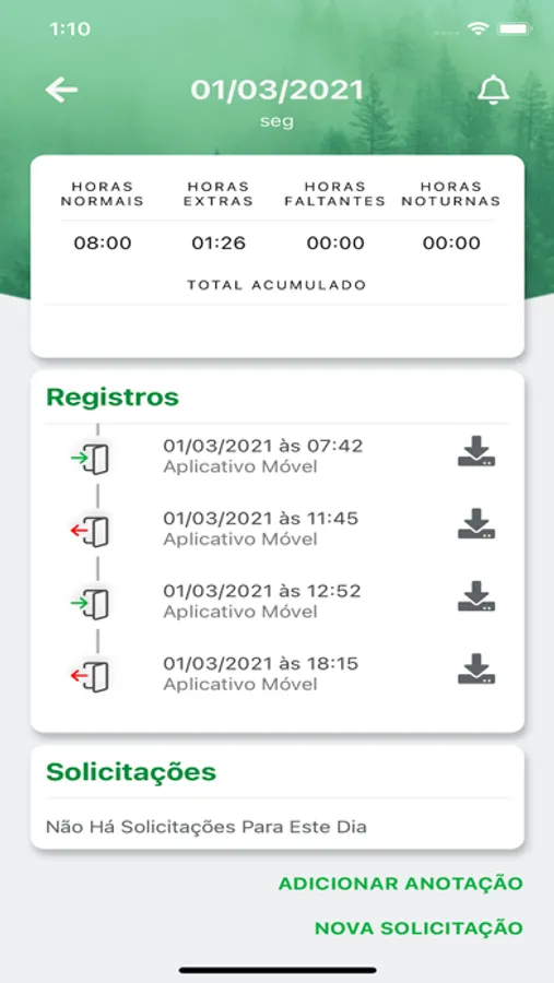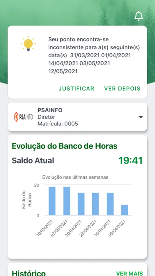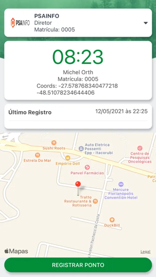O aplicativo registra o ponto e integra as informações com o sistema de fechamento de folha.
