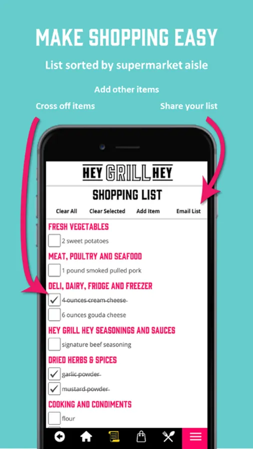 - EASY to use grocery list sorts recipes ingredients by supermarket section, add your own items & even share your grocery list with a friend.
