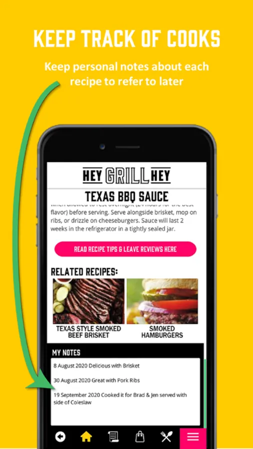 - NOTES - add your own notes to recipes so as to keep track of cook times on your grill, smoker or BBQ or who you cooked the recipes for, & what they think