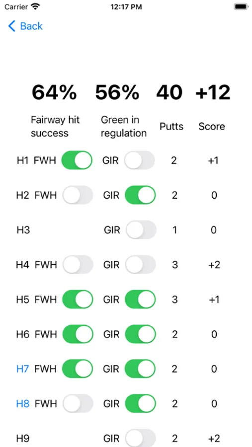 Designed for quick entry between holes, it helps many amateurs and trainees get accurate statistical data. (1. fairwayhit ratio, 2. green in regulation ratio, 3. number of putts.)