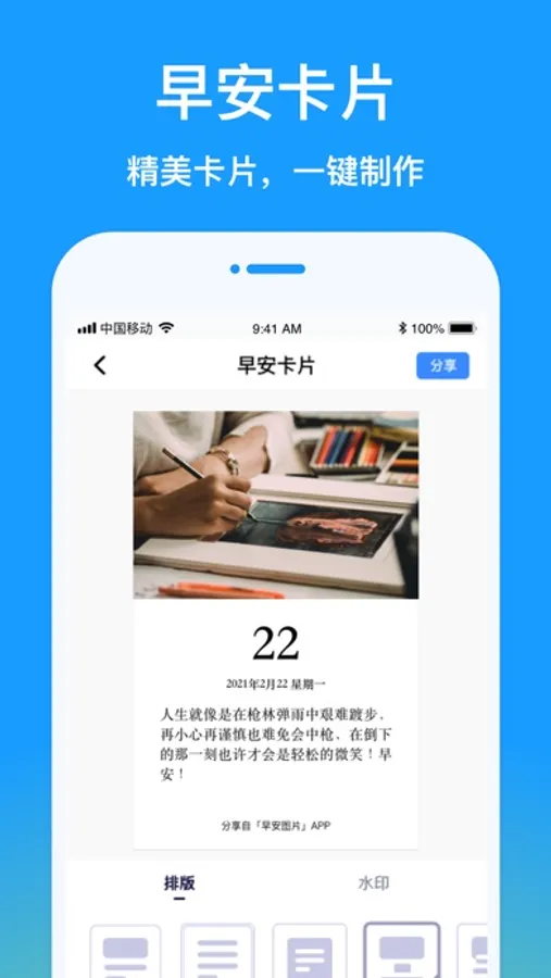 早安图片APP,每日清晨一张精美的图片+一句励志的早安语录,让您每天早上都有好心情!早安图片APP,每天分享最新的早安语录,励志文案,人生哲理,名人格言,优美语句搭配精美图片,让您每天心情愉悦,轻松引流。