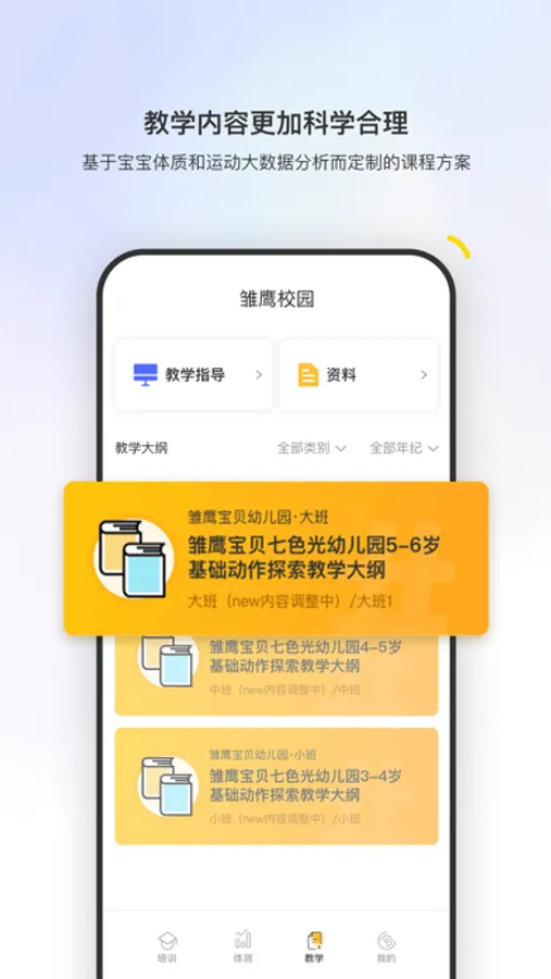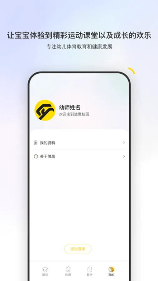 雏鹰校园App,面向雏鹰指导师及幼儿园签约教师,提供幼儿体育技能培训、在线测评、资格认证和在线查阅课程大纲、查阅课程教案等服务,并作为幼儿体测助手用于体测数据录入与查看。