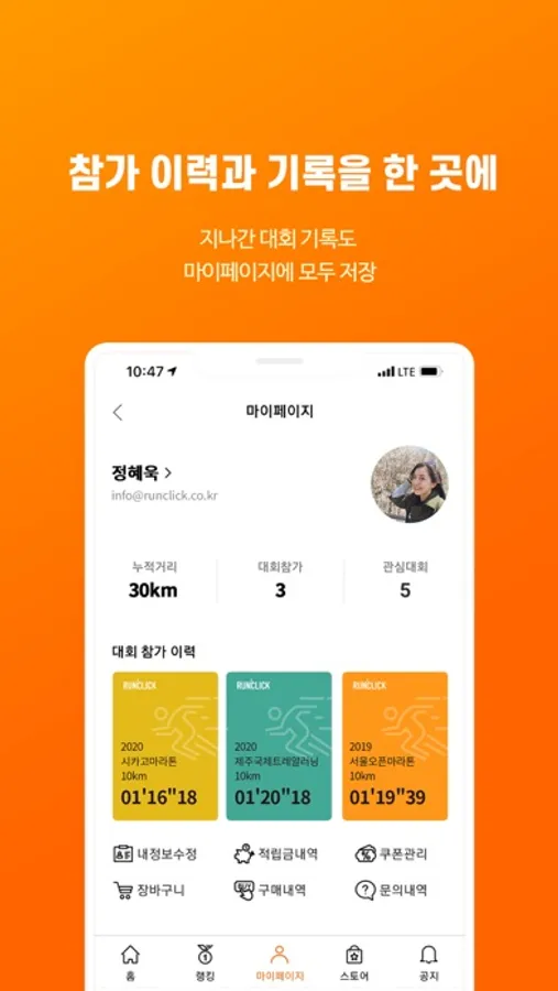 셋, 나의 참가이력과 기록을 원스톱으로 볼 수 있습니다.