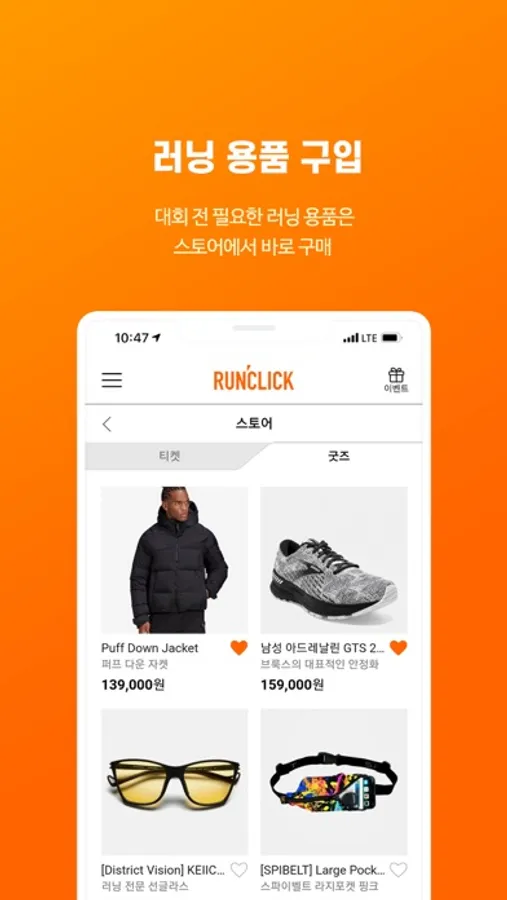 둘, 런클릭 맴버십 가입 고객을 위한 대회(티켓), 굿즈(마라톤 패션 잡화) 알림 서비스를 받아보고