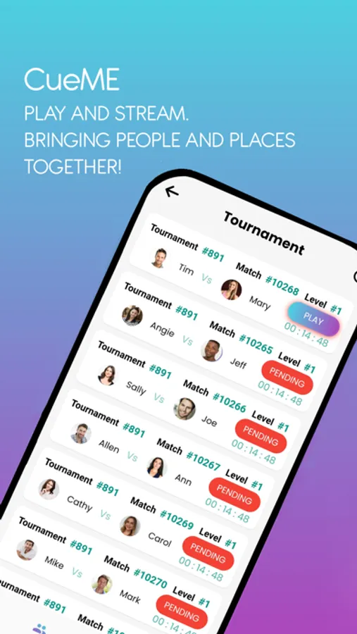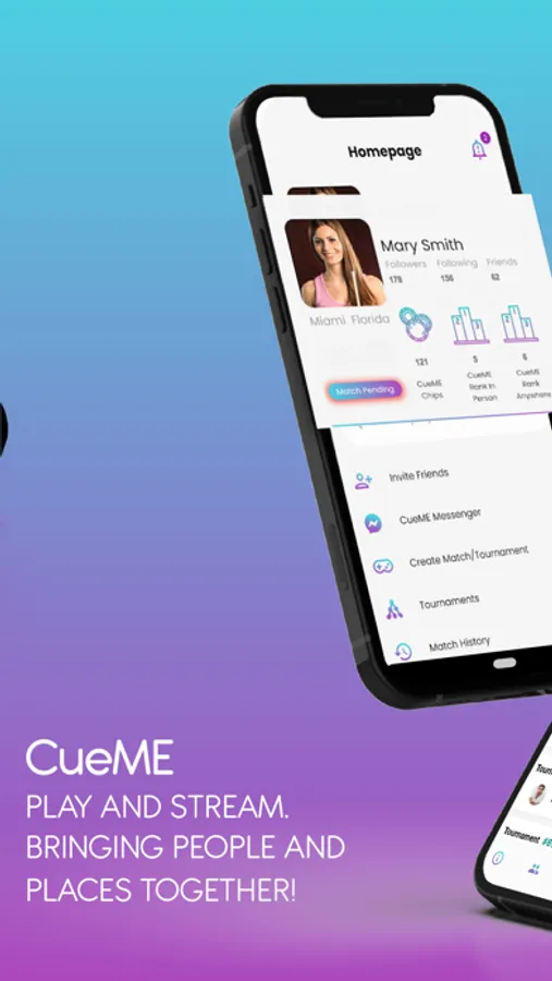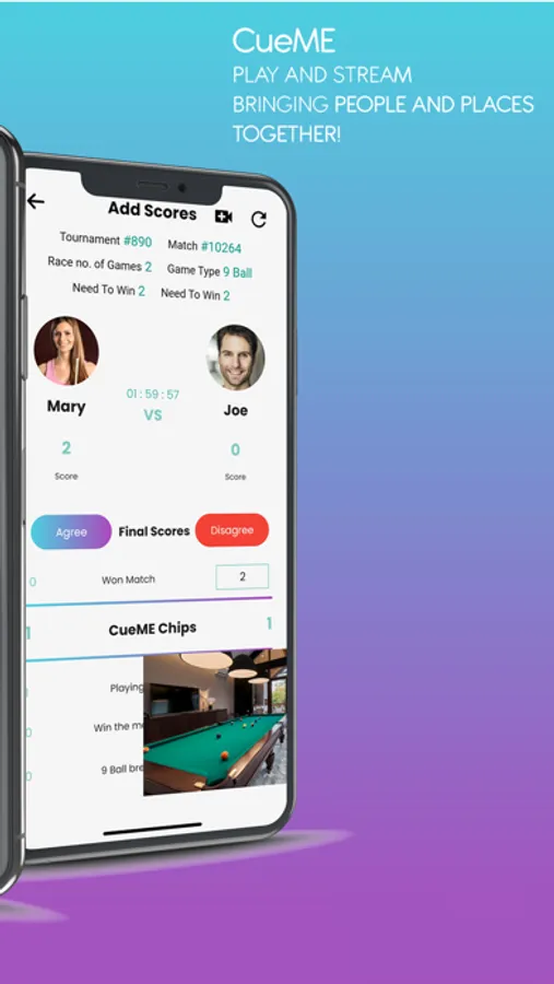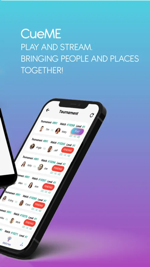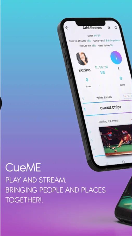 Play pool online with CueME live streaming. Find tournaments and matches all over the world to play in now! Play in person or virtually at any level of competition for singles, doubles, and tournaments. Play anyone anywhere from around the world with the CueME Live Streaming, scoring, and ranking technology. As you play, you will win CueME chips with wins and accomplishments for recognition and prizes. Venues around the world can send out notifications for tournaments and specials.