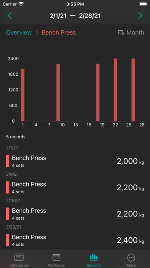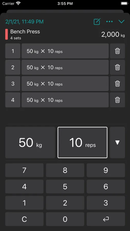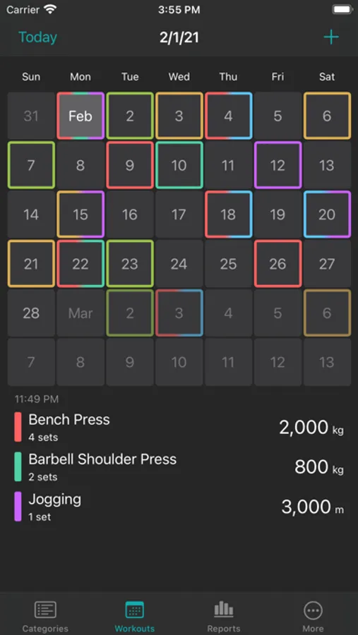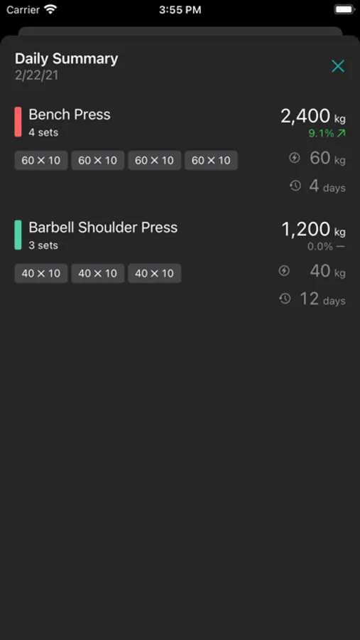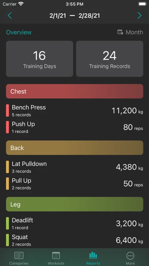- Customizable training categories and exercises (weight x reps, reps, distance, duration)