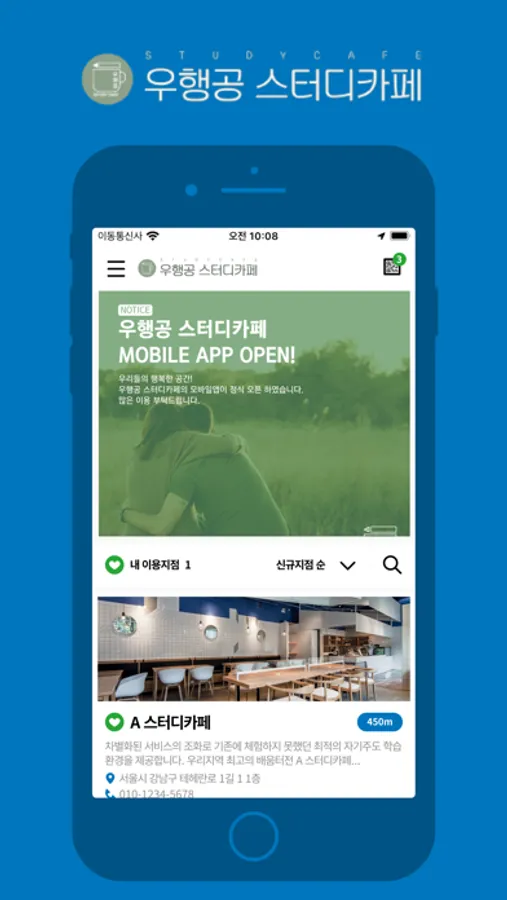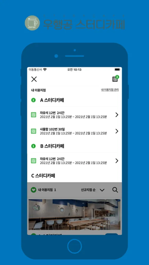 우행공스터디 어플리케이션을 통해 예약을 비롯한 각종 서비스 이용 및 결제를 편리하게 할 수 있으며 키오스크와의 연동으로 출입관리, 이용정보, 구매이력등 다양한 정보도 알 수 있는 편의성을 제공합니다.