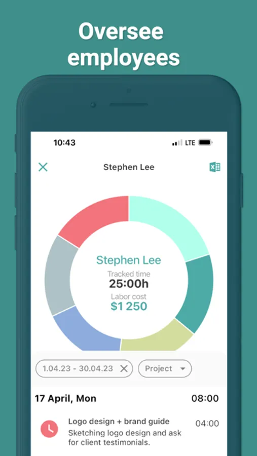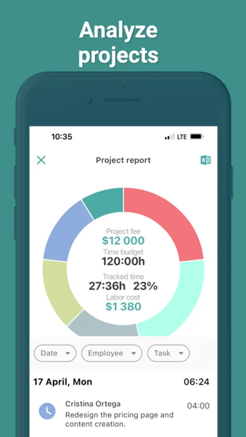 Build time reports by project, team member, client or service and always stay on top of changing hours, costs, budgets and more. You can easily export time reports in XLS to set up advanced calculations and projects billing.