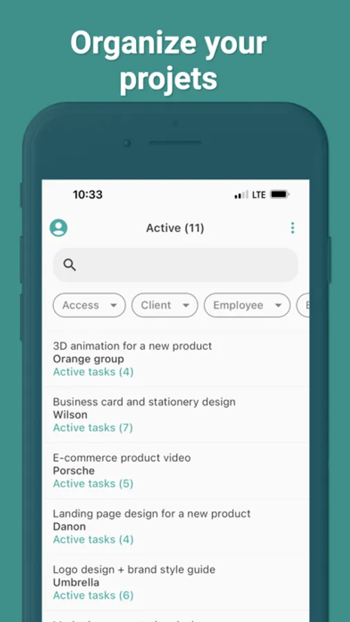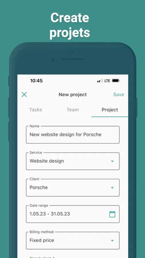 Create projects. Add project details, including project title, type of service, client and date range. You can choose one of two billing methods: fixed-fee and time-based.
