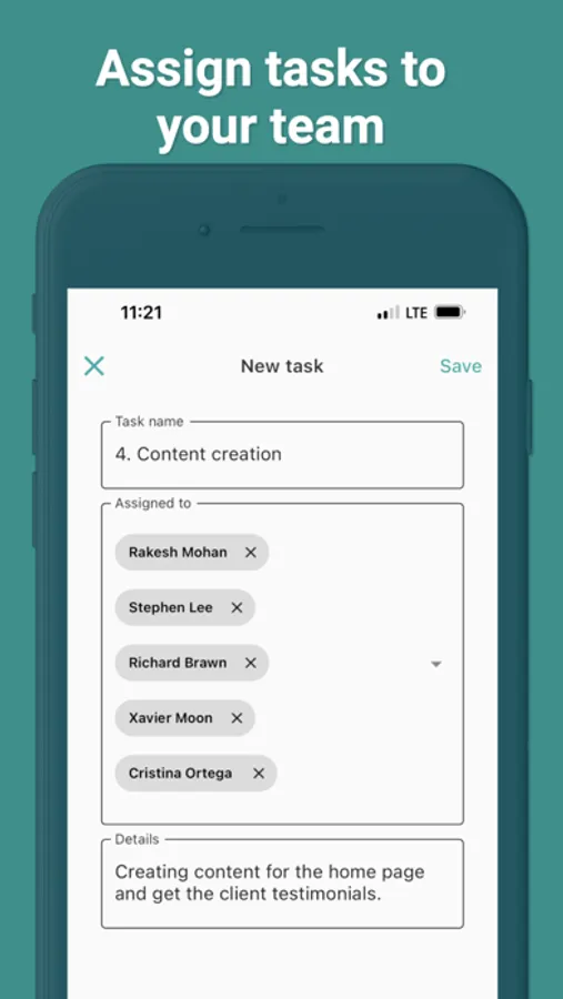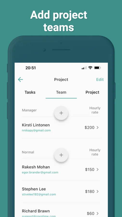 Add your entire team to Zorotime. Create project teams. You can assign a team member one of two access roles: Manager or Normal user. Manager can view and edit anything in assigned projects. Normal user can only track time on assigned projects and tasks.