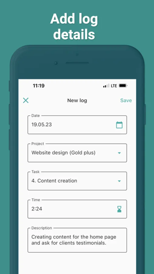 Track the hours your team spends on every project and task. Add project, task and detailed description to each time log. You can start a timer or add a time log manually.
