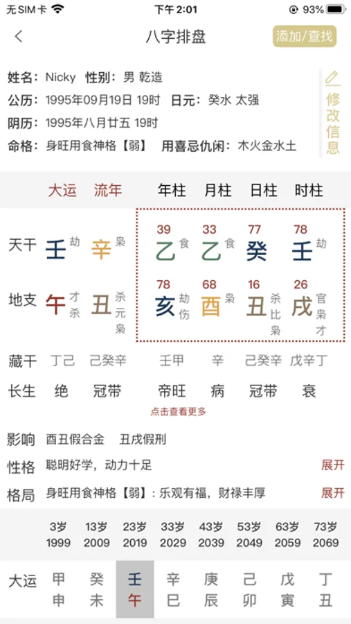 免费查看专业的八字命盘分析,可以到天干地支、十神、刑冲破害合、大运流年流月流日等等信息。让命盘信息更加清晰、使用更加简单。