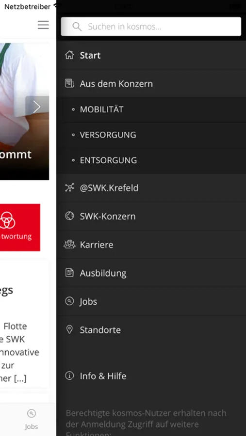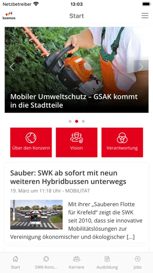 kosmos bietet Nutzer*innen die Möglichkeit über aktuelle Neuigkeiten, interessante Projekte, Karrieremöglichkeiten im Konzern und vieles mehr rund um das Unternehmensgeschehen der SWK STADTWERKE KREFELD AG informiert zu bleiben – mobil, schnell und auf den Punkt.