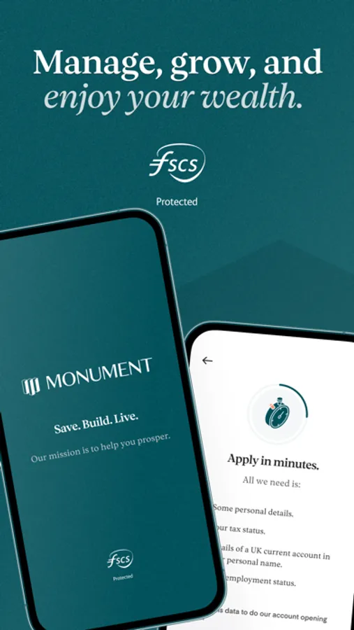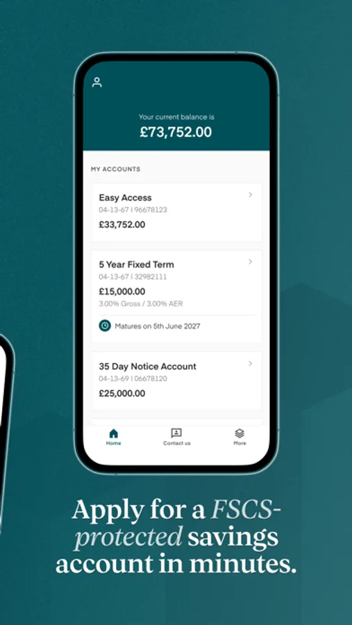 Our savings accounts, including Fixed Rate Deposits and Easy Access Savings, offer competitive interest rates with a minimum deposit of £25,000. Your eligible savings with us will be protected up to £85,000 by the Financial Services Compensation Scheme (FSCS). Open your account within minutes, and view and manage your savings anytime using the app.